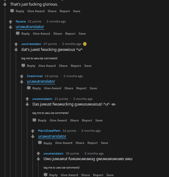 Translate English into uwu. The idea behind this phenomenon is a meme-based joke about making text and speech extra cutesy or uwu-ifiedThe subreddit ruwutranslator is an online community with over 12000 members that translates text from English into uwu based on both bot and human translations.